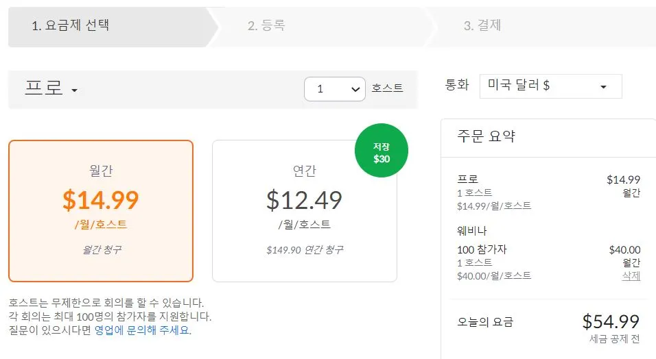 Zoom 의 웨비나 서비스를 이용하려면 [프로] 이상의 요금을 내고 있으면서, 거기에 추가로 웨비나 개최를 위한 프리미엄 요금을 결제해야 한다. [프로] 는 월 14.99$ 이고, [웨비나]는 월 40$ 부터 시작하니까, 웨비나 서비스를 이용하려면 최소 54.99$ 은 결제해줘야 한다는 뜻이다.
