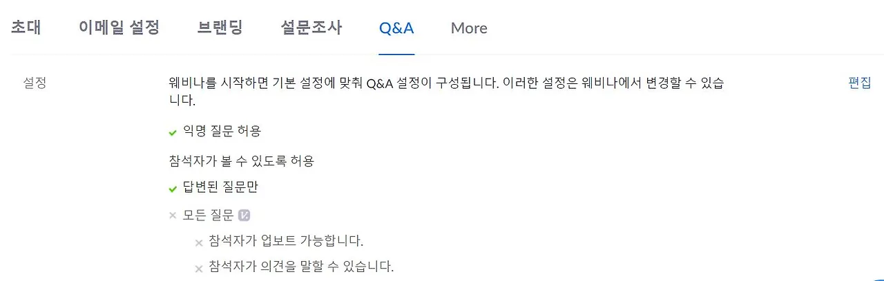 마지막으로, Q&A다. Q&A에 대해 할 얘기가 두 가지 있다. 첫 번째는 설정을 잘해둬야 한다는 것. 아래 캡쳐화면을 보자. 익명 질문을 허용할 것인가. 개인적으로는 이 설정이 큰 의미 없다고 생각한다. 왜냐하면 웨비나 등록 시에 실명확인까지는 하지 않기 때문에, 여러 이유로 자신을 드러내고 싶지 않은 사람에게는 이러나 저러나 옵션이 있기 때문이다. 이건 뭐 생각하기 나름이니 넘어가도록 하자.