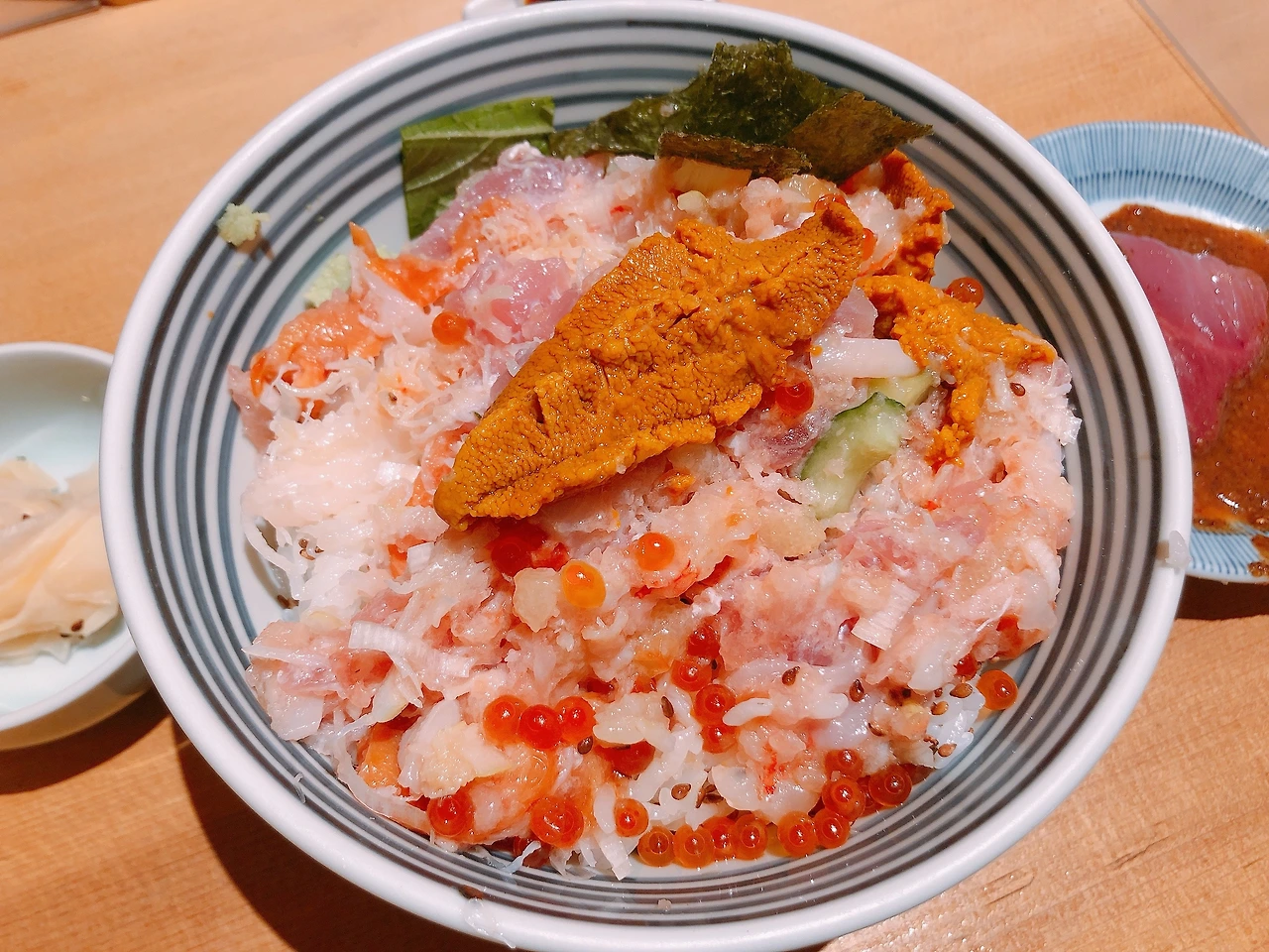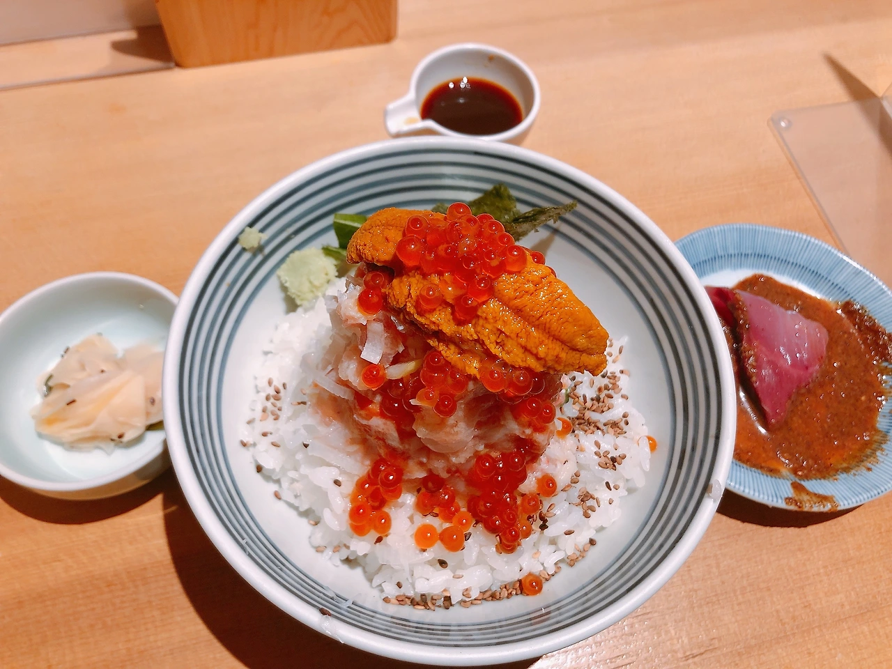 아, 사진을 보니까 또 먹고 싶다. 오키나와의 지역 특산물로 꼬들꼬들한 식감이 매력적인 고야나, 한국의 꺳잎처럼 일본에서 많이 먹는 향채(香菜)인 시소, 해산물이 모자란 순간에 밥이랑 싸 먹기에 딱 좋은 김 등등이 중간중간 섞여있다. 해산물도 부드러운 식감이 주를 이루는 가운데, 중간중간 이쿠라(연어알)의 터지는 듯한 식감과, 흰살생선의 조금 단단한 듯한 식감을 함께 즐길 수 있어 한 입 한 입이 심심하지가 않다.