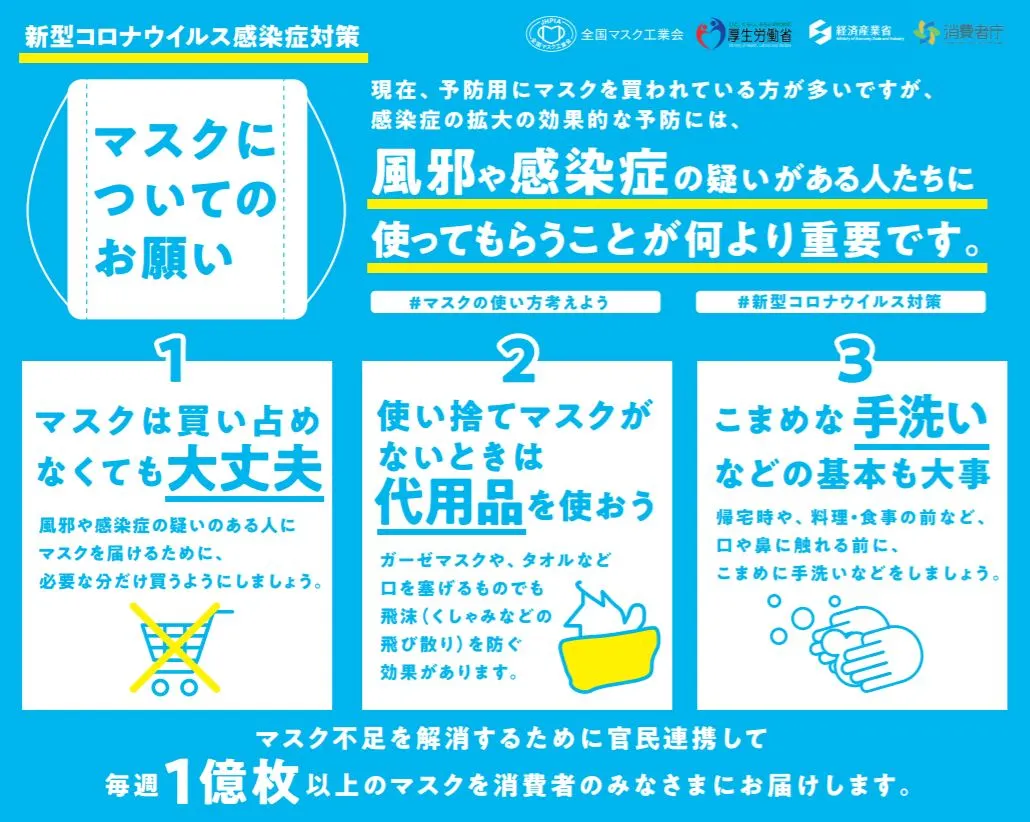 마스크와 관련해서 마스크 생산자 및 관련 정부부처에서 보내는 대국민 메시지는 다음과 같다. (전국 마스크 공업회, 후생노동성, 경제산업성, 소비자청 공동 배포)