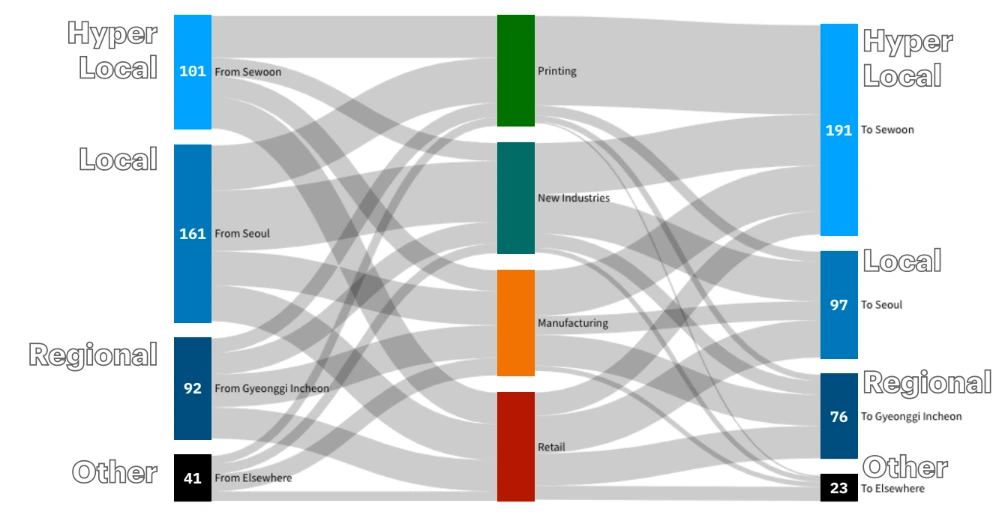 연구결과 매우 높은 비율이 사업체들이 수주, 하청, 유통으로 세운 일대라는 ‘하이퍼로컬’ 안에서 긴밀하게 연관되어 있음이 확인되었다. 특히 인쇄업종의 경우 세운 일대 안에서의 협력관계가 더욱 긴밀한 것으로 밝혀졌는데, 약 40%가 세운 일대에서 일을 수주받고 80% 이상의 업체가 세운 일대 안에서의 하청을 통해 생산을 수행하는 것으로 나타났다. 단 17%의 도소매업 사업체만이 세운 일대 제조업체들과 연관되지 않았다고 답했으며, 제조업체의 부품을 공급하거나 이웃 업체를 통해 보수, 수립 등의 서비스를 제공하는 등 생산공정의 전후 과정에 연결되어 있음을 확인할 수 있었다. 또한 이들 도소매업종은 이 일대에 최근 유입된 신규업종들과 함께 로컬 네트워크에서 생산된 제품을 광역적으로 유통하는 매개 역할을 담당했다.