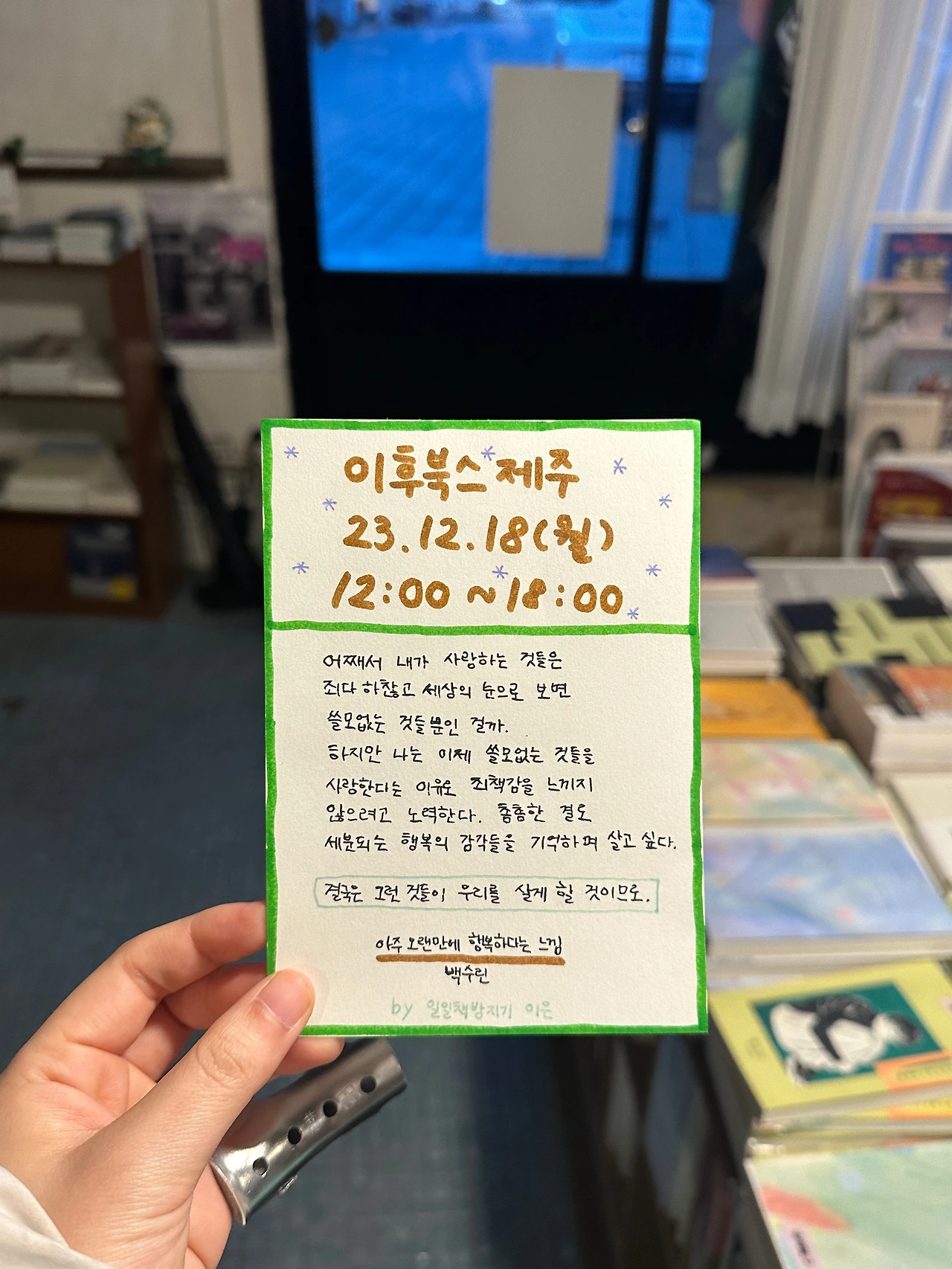 충동적으로 제주행을 결심했던 11월의 어느 날, 일일 책방지기 모집 글이 눈이 들어왔어요. 모집글 속 딱 하나 비어있던 일정은 저의 제주 여행 일정과 딱 들어맞았고요. 하고 싶다는 생각이 해야 할 것 같다는 결정으로 바뀌는 순간이었어요. 결정을 하기까지 했던 고민은 ‘감히 내가 해도 되는 걸까’하는 것이었는데, 이 고민에 대해 주변 사람들이 내놓은 답은 제주까지 가서 일을 해야 하냐-, 쉬러간다면서 그게 휴식이냐- 였습니다.