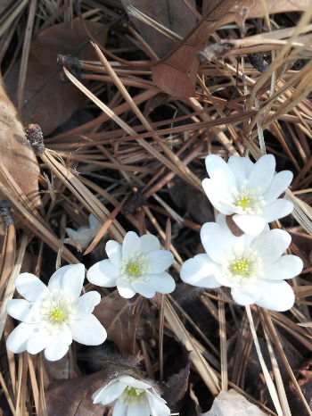 여러 송이의 노루귀 ( 침엽은 소나무의 잎이다)