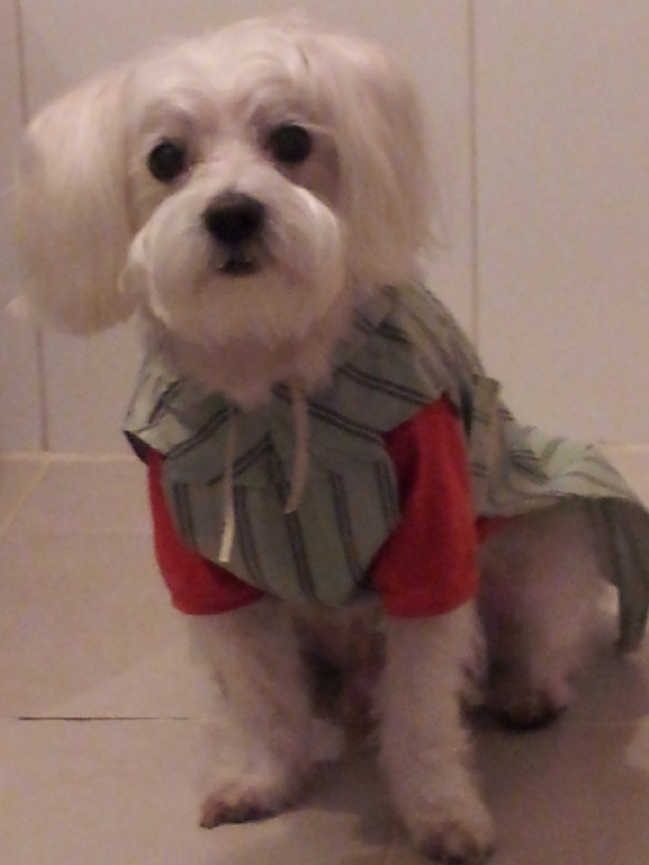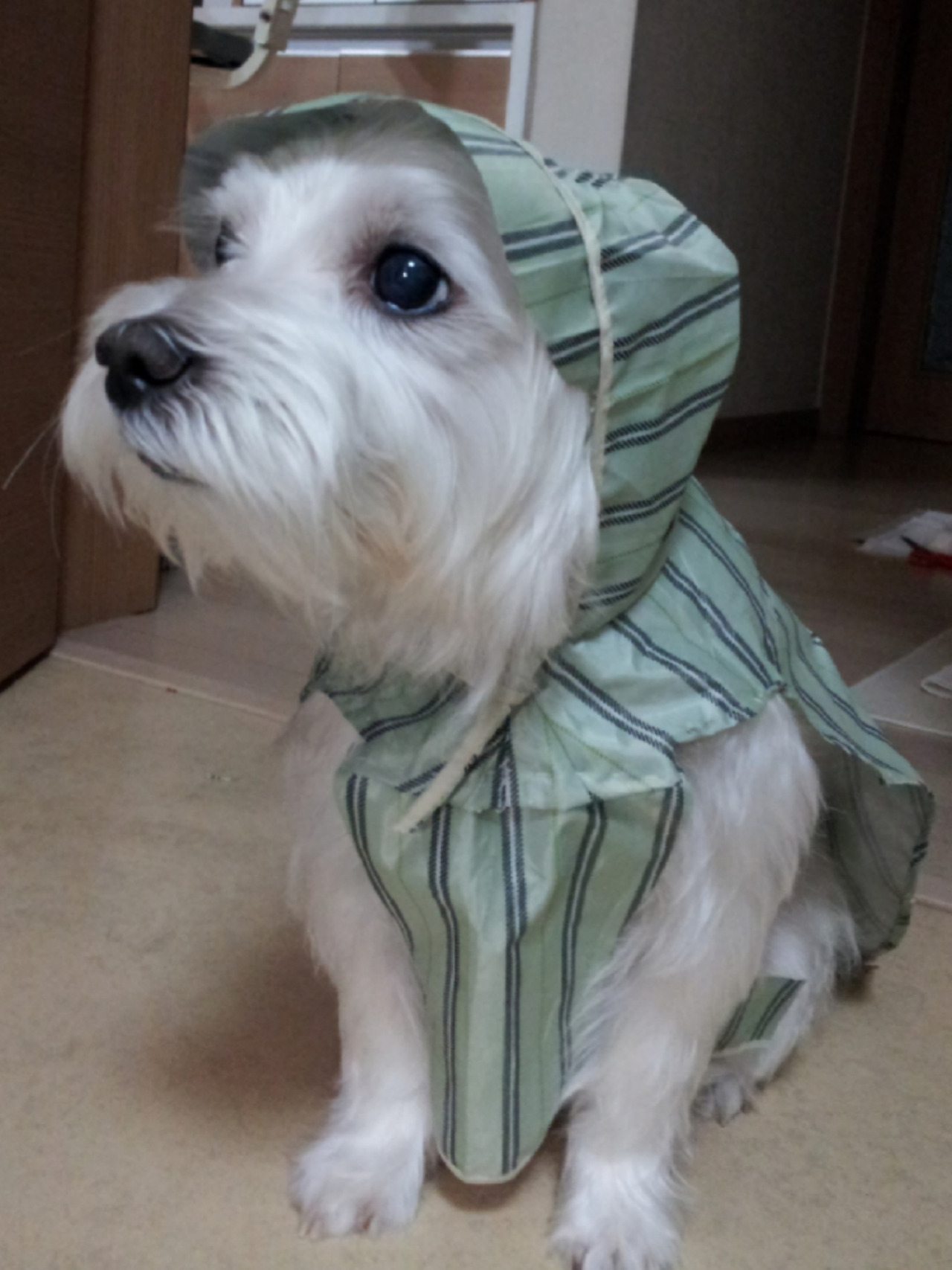비교적 크기가 큰 마트의 비닐봉지를 오려서 강아지 몸에 맞추어 잘라 묶어 입혔다. 지퍼백의 짚 부분을 얼굴에 맞춰 비닐옷에 옷핀을 써서 모자를 만들어 붙이니 아쉬운 대로 그럴듯했다.