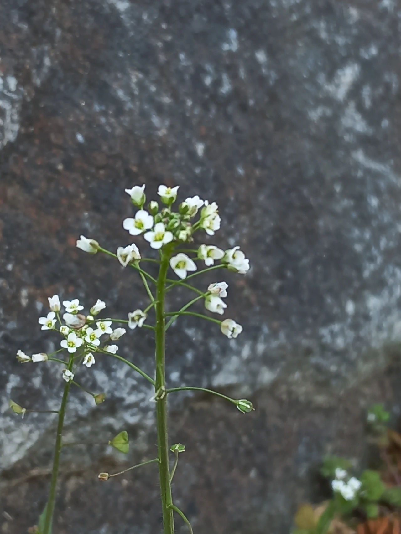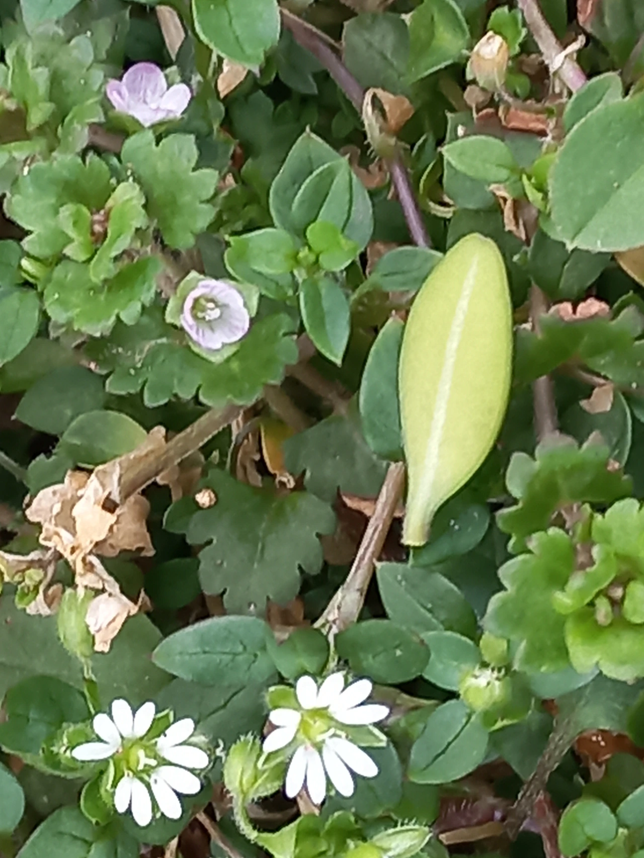 냉이꽃(좌), 개불알풀(연보라빛)과 별꽃(우:회양목 잎의 크기로 꽃의 크기를 짐작할 수 있다)