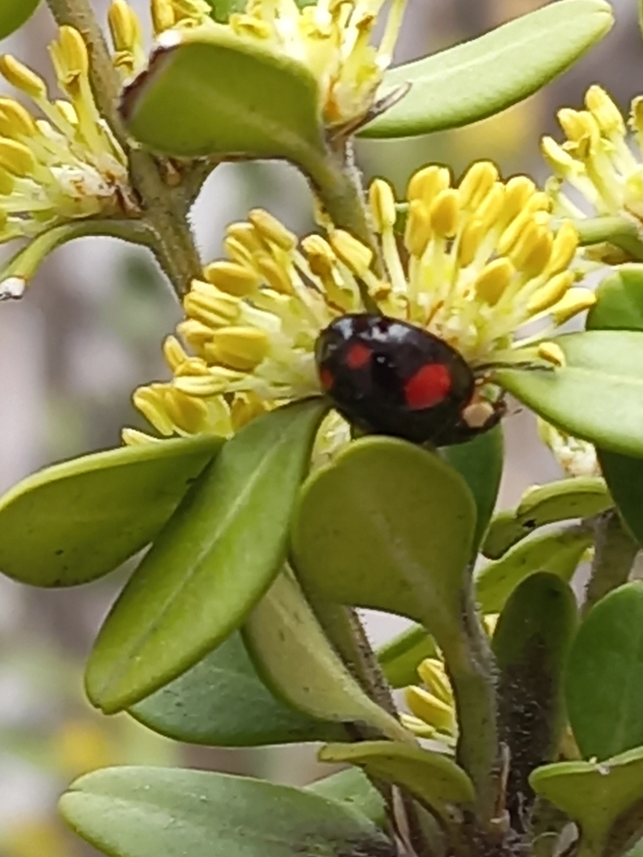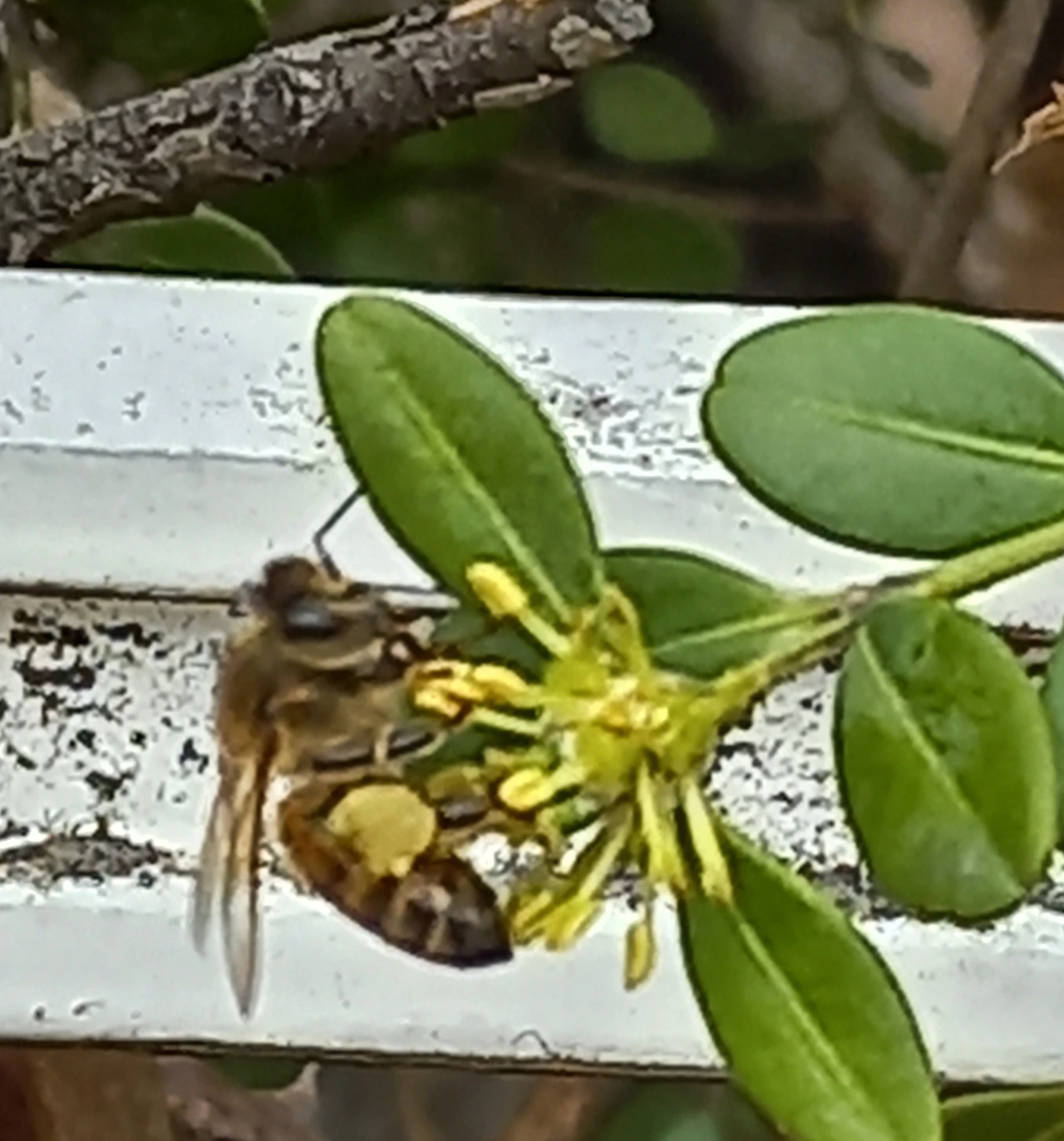 회양목 꽃에 벌과 무당벌레가 앉았다. 벌의 발에 노란 꽃가루 덩어리가 보인다.