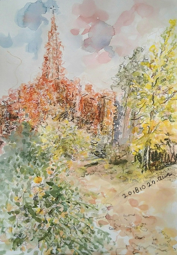 테이블 위에 의자를 올리고 그림 도구와 커피 잔까지 챙겨 날름 올라앉았다. 창밖 풍경 중 담쟁이덩굴을 붉은색 수채 크레용으로 몽글몽글 스케치하기 시작했다.