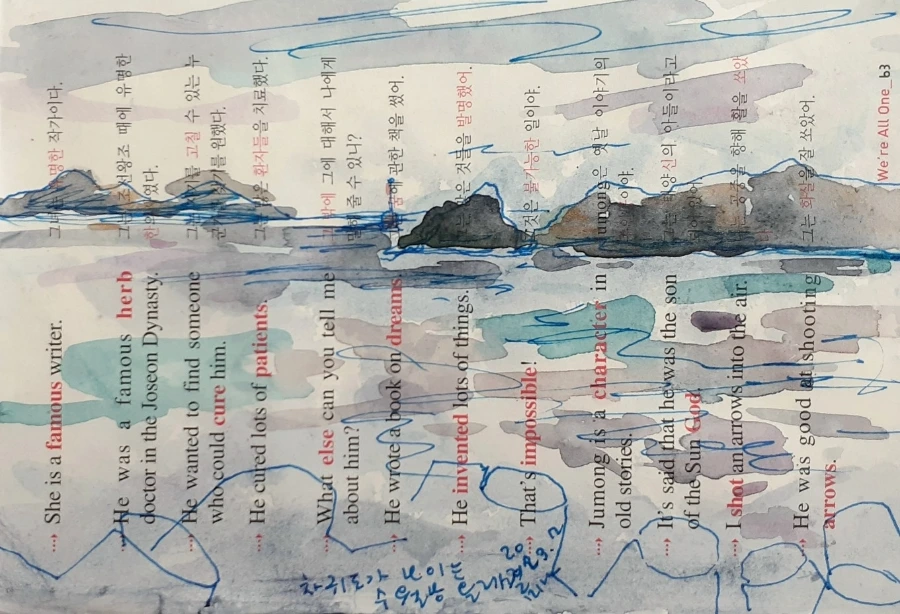 큰고기는 안 나오고 다리가 아파서 비상식량 건빵을 꺼내 몇 알 먹고 커피도 한 모금 마셨다. 낚시가 지루해져서 종이와 펜, 팔레트를 꺼냈다. 물이 없어서 갯바위에 고인 물을 찍어 물감을 풀고 저기 보이는 섬과 노랑 등대의 실루엣을 그린다. 빗방울이 떨어지기 시작했다. 저절로 물감이 번지니 나쁘진 않았지만 비가 많이 와서 서둘러 스케치와 낚시를 끝내야 했다. 낚시 조과는 쥐치와 벵에돔 그리고 이름을 알 수 없는 고기 몇 마리로 마감했다. 2023. 봄 차귀도가 보이는 곳에서
