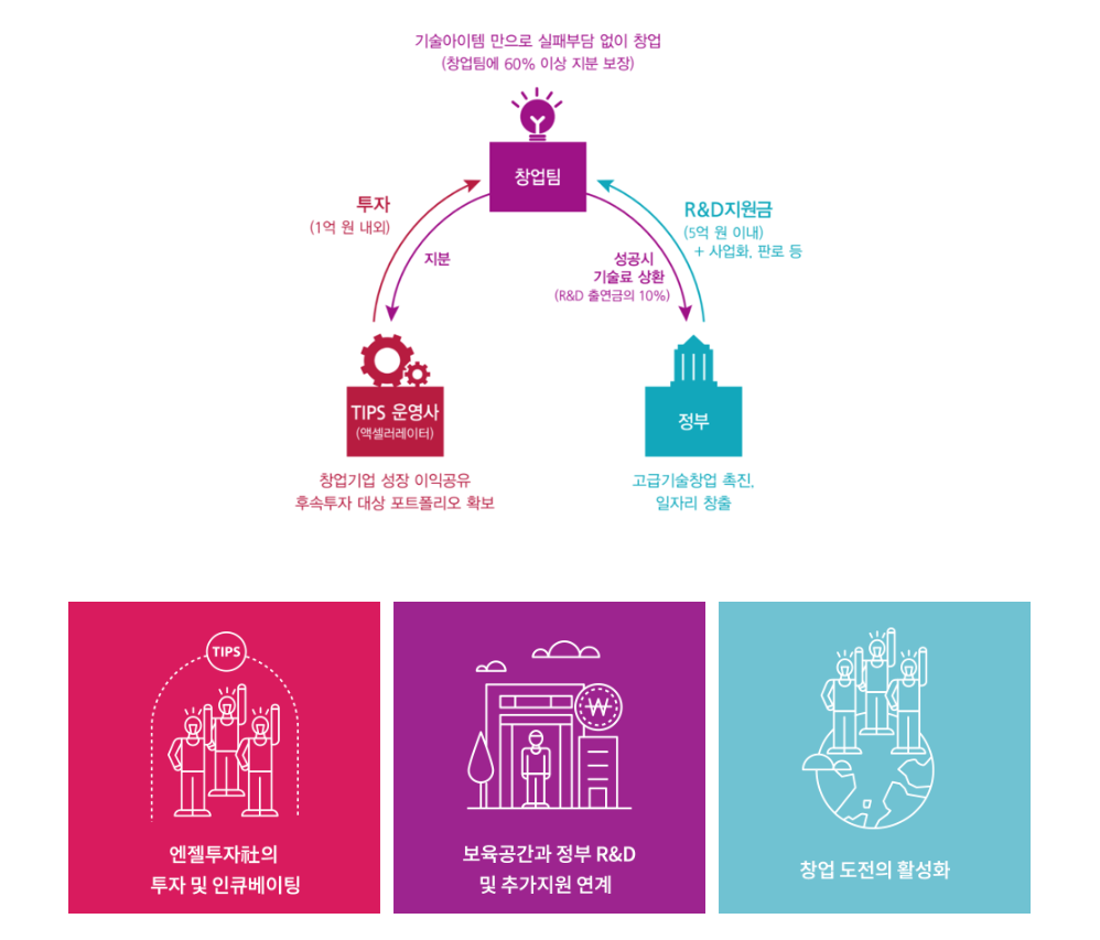 한국은 2013년부터 이스라엘 TIPS 제도를 벤치마킹하여 도입했으며, 현재는 R&D 사업비 지원을 넘어 글로벌 진출이 지원, 딥테크 분야 추가 지원 등으로 영역을 확대하고 있다.