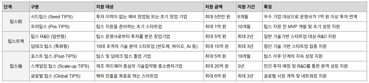 크게 팁스 전 단계, 팁스 본 트랙, 팁스 후 단계로 나뉘는데 각 단계별 하나의 프로그램을 선택하여 진행하는 식이다. 예를 들어 팁스 전 단계인 시드팁스와 프리팁스는 중복 지원할 수 없다.