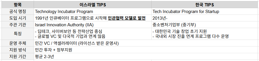TIPS (Tech Incubator Program for Startup)는 기술 기반 스타트업의 혁싱성과 임팩트는 크지만, 시장 진출 전까지의 자금조달이 어려움을 민간 VC가 먼저 스타트업을 선별하고 그에 따라 정부가 매칭 펀딩 또는 보조금 형태로 지원하는 방식으로 이스라엘에서 시작된 프로그램이다.