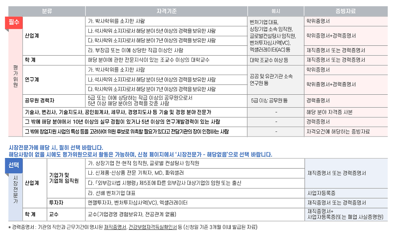 창업진흥원에서 공공기관 차세대 사업관리시스템(PMS)에 등록될 수 있는 평가 위원 기준표를 공개했다. 최소한 남을 평가(심사)하기 위해서는 관련 분야에 7년(학사 기준) 이상 경험은 있어야 하지 않겠냐는 기준이다.