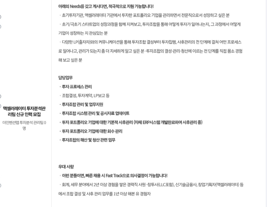 JD의 공통된 부분과 위 공고 외에 자료를 일부 수집해서 정리해봤다. 처음 액셀러레이터를 접하는 분들께 조금이나마 참고가 되기를 희망한다.