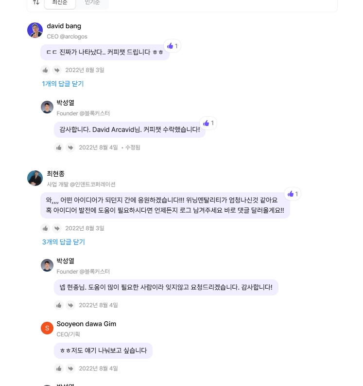 대표님의 글 「사업 아이디어 101」은 초기 아이디어 검증 및 팀빌딩의 우수 사례로 바이럴 되고 있는 만큼, 무언가의 과정에 대한 글은 다른 사람의 도움이 될 수 있고, 실패에 대한 레슨런을 공유하는 것 또한 다른 사람에게 귀감이 된다는 것을 글을 정리하며 느낀다.