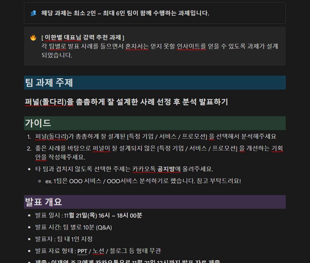 인상이 너무 서글서글하고 좋으셨다. 특히, 우리 팀의 조별과제가 실제 도움이 되셨다는 피드백을 들었을 때 많이 기뻤다.