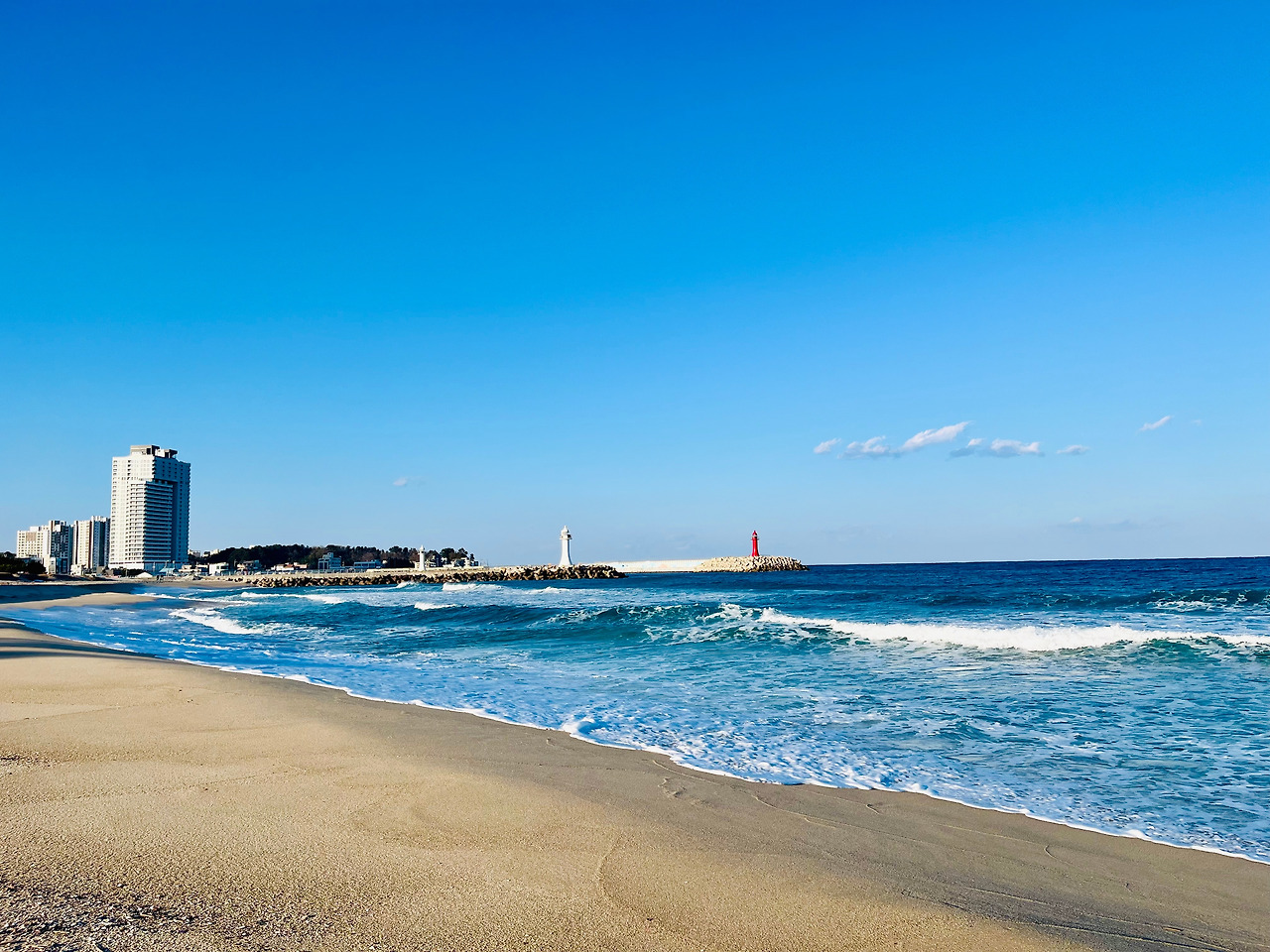 [메인 이미지 대체 텍스트: 맑은 겨울 하늘 아래, 파도가 하얗게 부서지는 강릉 사천해변의 푸른 바다와 모래사장]
