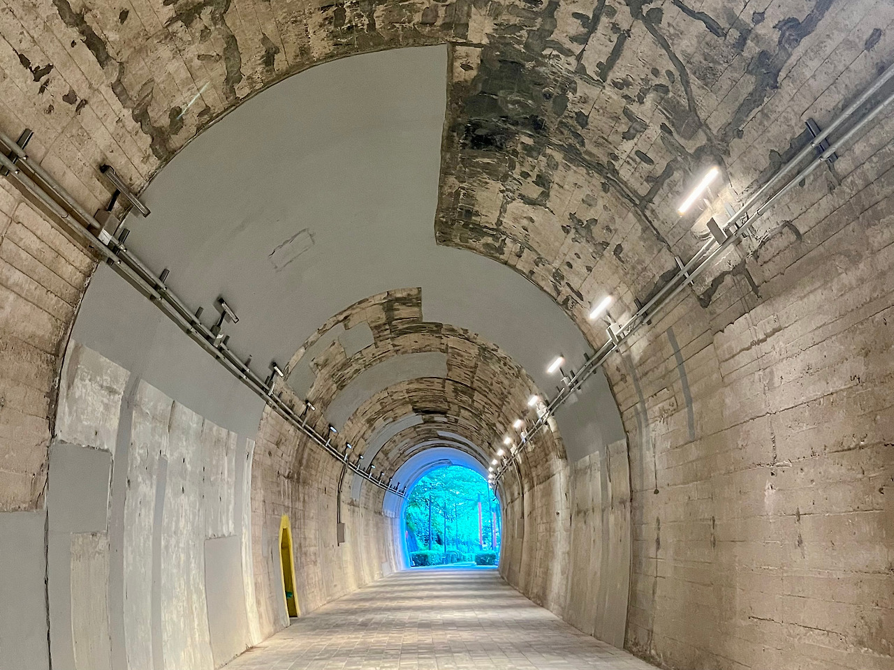 [대체텍스트: 조명이 켜진 아치형 터널 “벽면이 자연석처럼 거칠게 남아 있는 아치형 터널 내부. 회색 페인트가 부분적으로 칠해져 있고, 위쪽에는 밝은 조명이 일정한 간격으로 설치되어 터널 안을 고르게 비춘다. 터널 끝에는 푸른 나무와 바깥 풍경이 밝게 빛나며 출구가 열린 듯한 느낌을 준다.”]