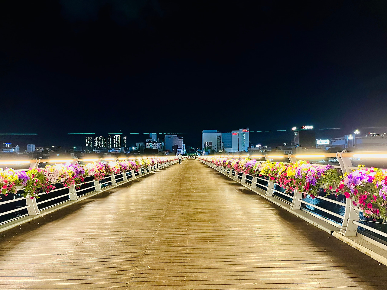 [대체텍스트: 밤의 꽃길과 도시의 불빛 “밤하늘 아래 나무로 된 보행자 다리가 길게 뻗어 있다. 다리 양쪽에는 형형색색의 꽃들이 풍성하게 심어져 있고, 따뜻한 조명이 꽃과 길을 부드럽게 비춘다. 멀리 도심의 빌딩들이 조명에 반짝이며, 한 사람이 조용히 다리 끝을 향해 걷고 있다.]