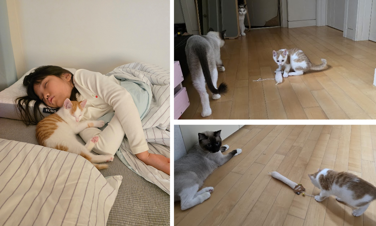 지금은 두 오빠 고양이들도 적당한 관심을 보이며 사이 좋게 지낸다.
