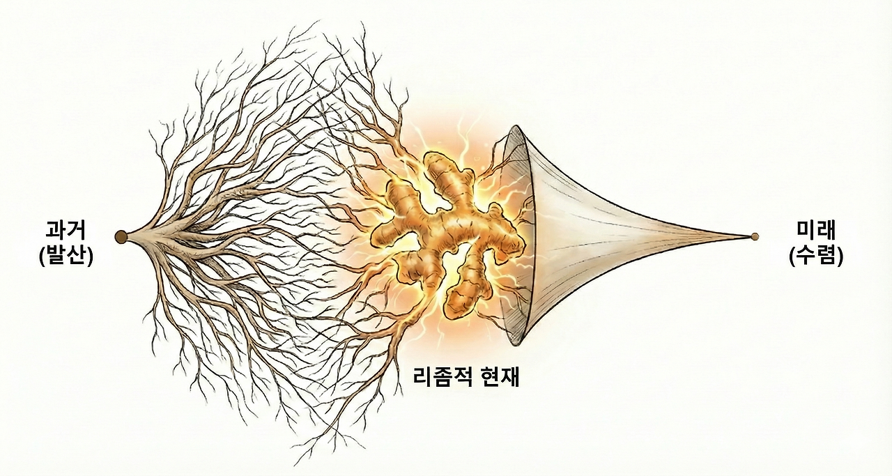 · 리좀 개념 적용해 과거의 무한한 해석과 미래의 구체적 선택이 현재에서 만남.