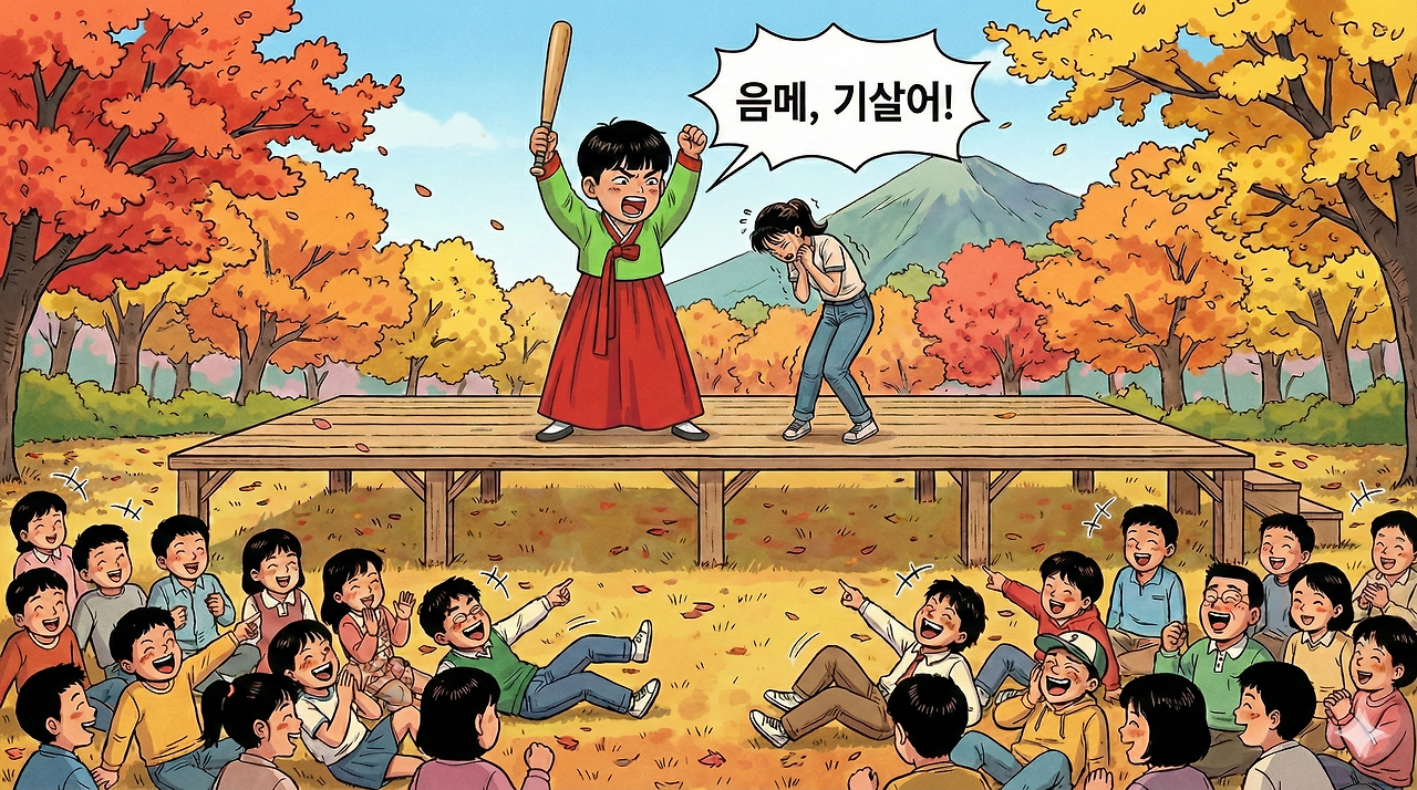 미간에 일자(一字) 눈썹을 칠하고 몽둥이를 든 채 "음매, 기 살어!"를 외치며