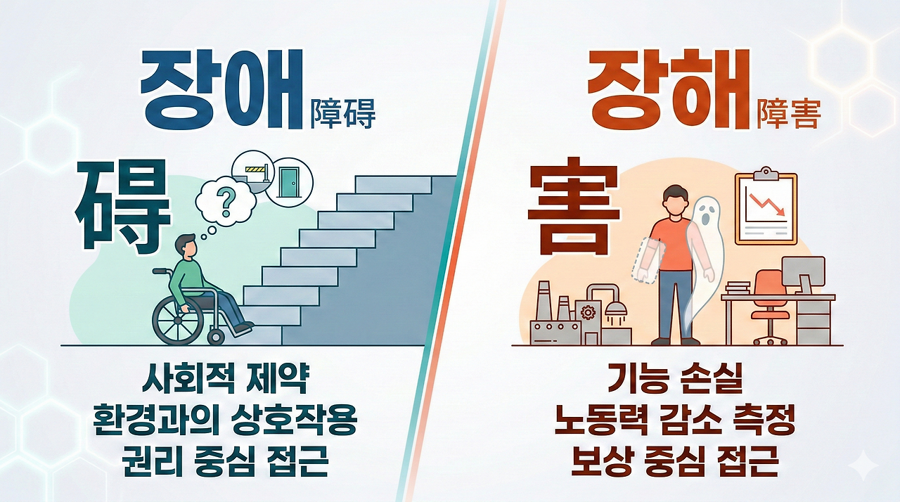반면 '장해'는 부상이나 질병 치료 후 신체에 남은 영구적인 기능 손실을 뜻한다.