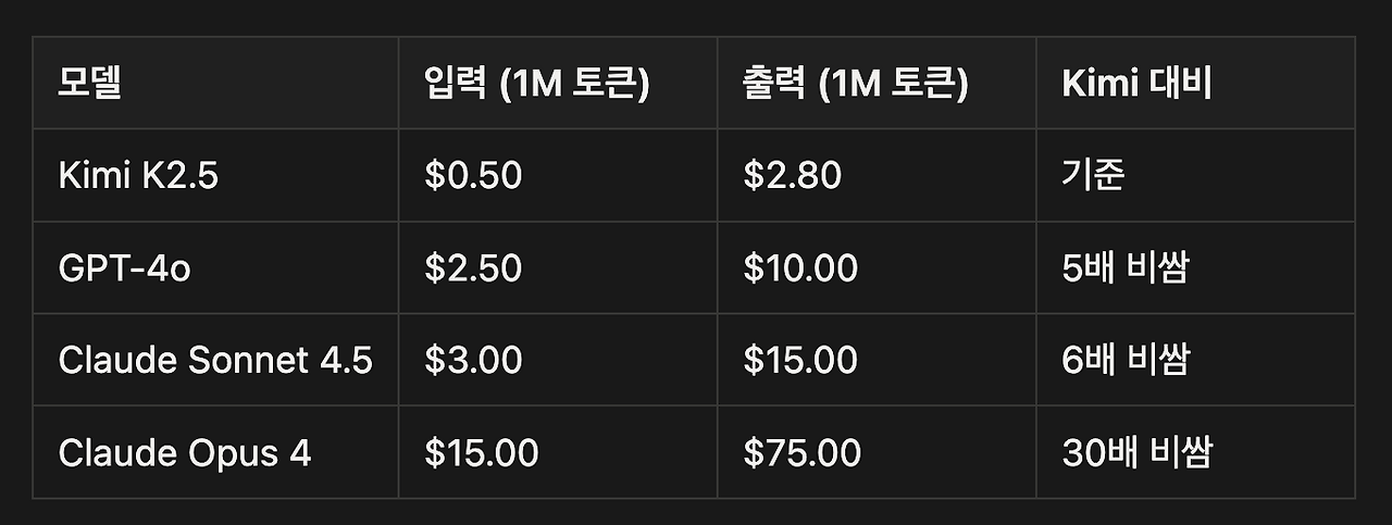 Kimi K2.5는 "Claude Opus급 성능을 GPT-4o 가격의 1/5로" 제공하는 모델입니다.