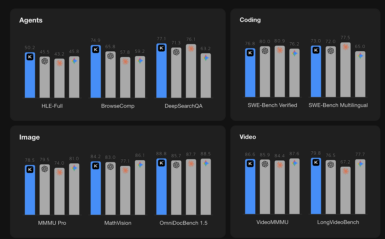 소개 자료에 따르면, Kimi K2.5는 "Claude Opus 4를 들고 와야 상대가 될 정도"의 성능을 보여줬습니다. HLE(Humanitys Last Exam) 벤치마크에서 50.2%로 글로벌 1위를 기록했고, 코딩과 비전 분야에서도 오픈소스 모델 중 최고 성능입니다.