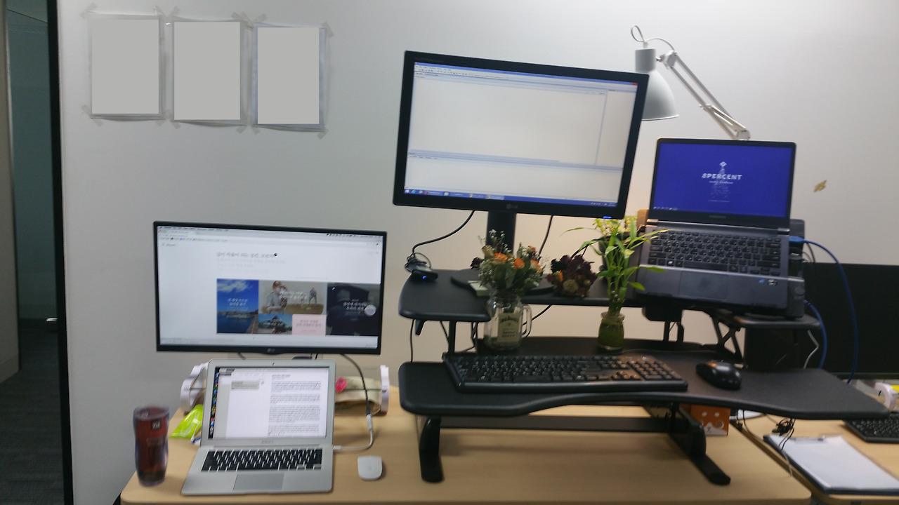 석환님이 VARIDESK PRO PLUS 36을 좋은 가격에 하사해주셨다. 서기도 하고 앉기도 할 수 있는 작업환경이 구축되었다. 석환님은 하루 종일 서서 일했다고 하셔서 도전해보았는데, 단 세 시간만에 자아가 분열되기 시작했다. 체력이 많이 부족하구나, 싶어서 VARIDESK 홍보자료를 찾아보았더니 하루 세 시간씩 서서 일하면 1년 동안 마라톤을 열 번 뛴 운동량과 맞먹는다는 내용이 있었다. 내가 약한 게 아니었어! 일하면서 마라톤을 뛸 수 있게 되었다.