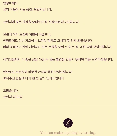 사실 가볍게 블로그 같은 서비스일 거라고 생각했다. '오늘도 밥 세 끼 잘 먹었네' 수준의 글을 너덧 줄 끄적여 신청했었다. 정말이지 거절당해도 싼 글이었다. 거절을 당할 것이란 생각조차 못했다. 살면서 거절을 많이 당해 익숙했지만, 브런치의 거절에는 좀 놀랐던 것 같다. 열심히 써야겠네.