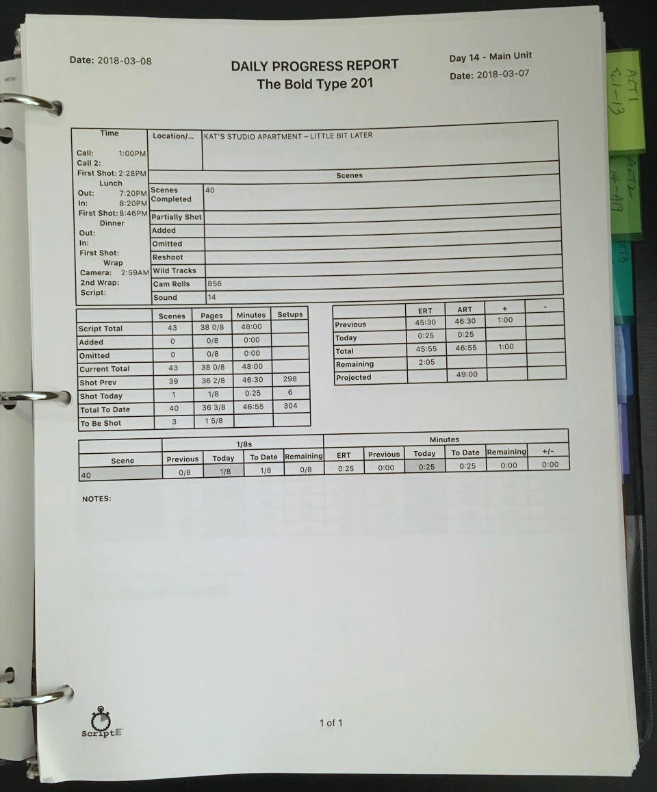 먼저, Daily Progress Report, 혹은 End of Day Report라고 불리는 부분입니다. 여기엔 몇 시에 촬영을 시작해서, 점심은 언제 먹었는지, 그리고 촬영은 언제 끝났는지 표시되어 있습니다. 또한, 이날 어떤 신을 촬영했고, 혹시 이중에 씬의 일부만 촬영한 한 씬은 있는지, 찍기로 계획했었는데 찍기 못한 씬이 있는지도 기재되어 있습니다. 이외에도 촬영된 시나리오의 페이지 수 등 여러 가지 정보가 담겨있습니다. 이름에서 알 수 있듯이 그날 무슨 촬영을 했는지 간단하게 정리한 한 장의 리포트라고 할 수 있습니다. 그날 어떤 씬을 촬영했는지 빨리 확인하는데 유용합니다. 또한, 나중에 촬영 내용에 대한 확인이 필요할 때 얼른 참고할 수 있는 좋은 자료이기도 합니다.