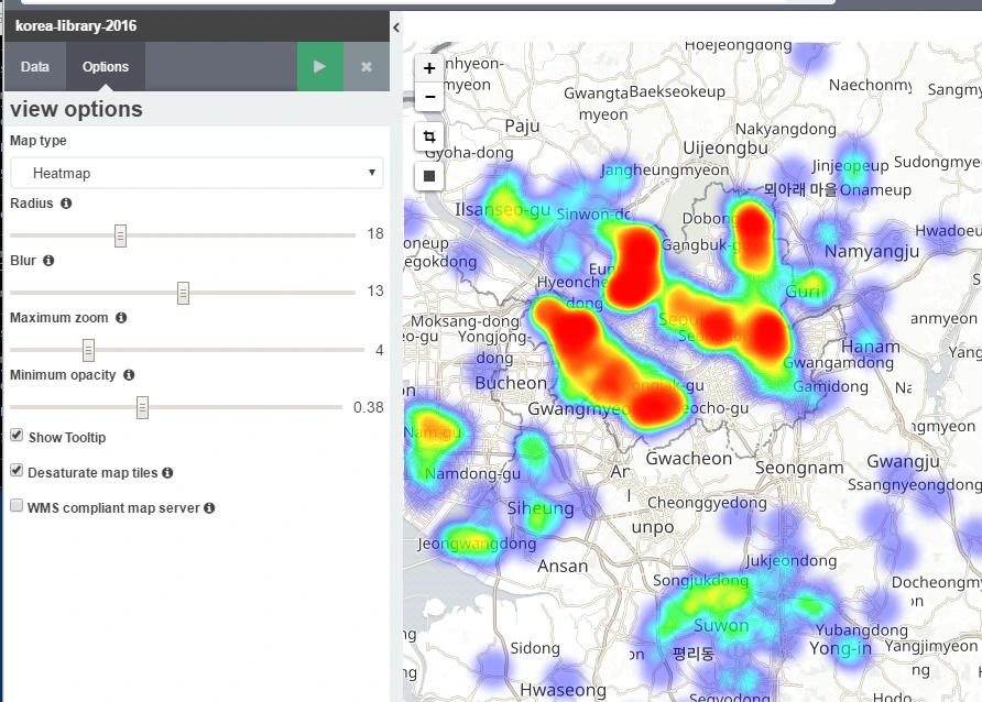 만약, 밀집도를 보고 싶다고 하면 Options에서 Heatmap 타입으로 설정하고 값을 조절하면 아래와 같은 모습을 확인할 수 있습니다.