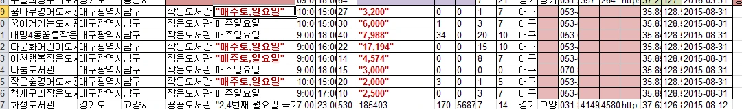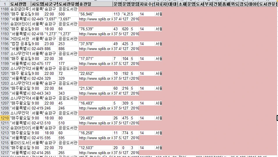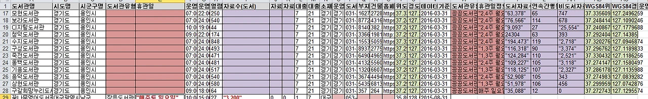 이를 정제한 과정은 다음을 살펴보세요. 정제한 결과물의 링크는 정제된 도서관 표준데이터(csv)를 참조하세요.