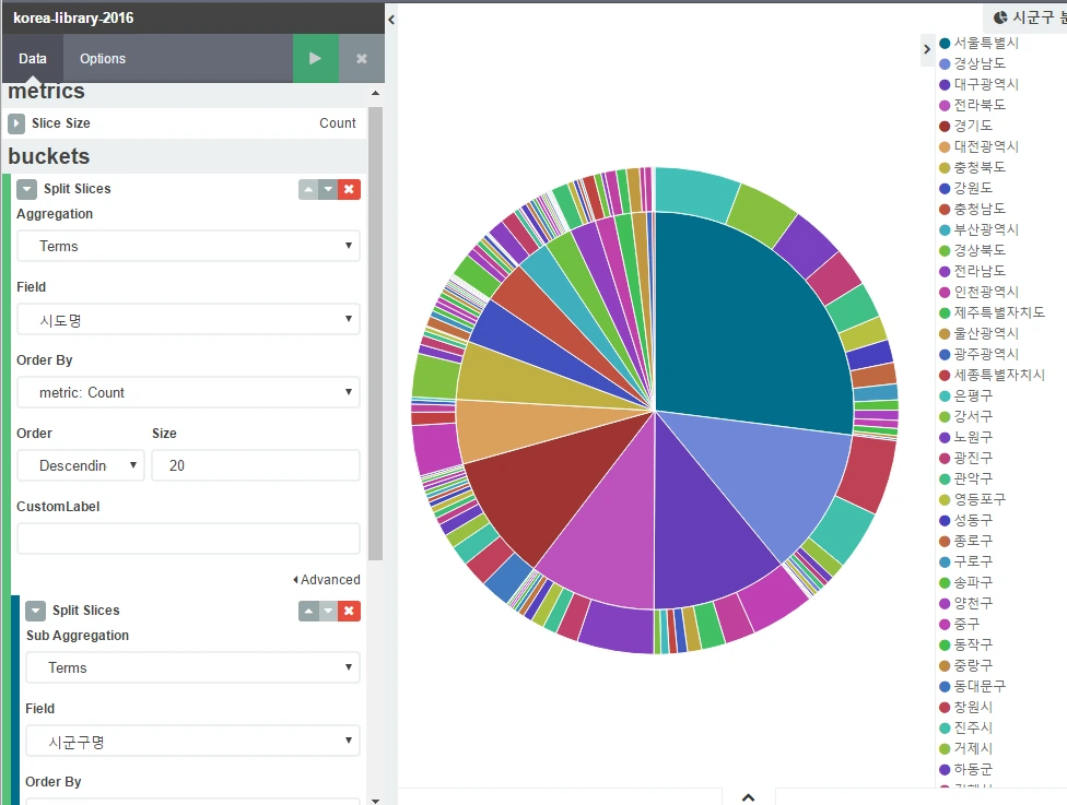 Aggeration은 Terms를 선택하고, 원을 도서관유형 기준으로 잘라줍니다.