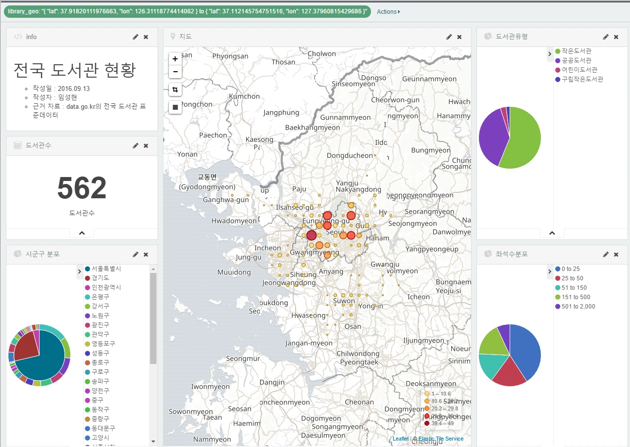 이번에는 ELK로 공공 도서관 정보를 활용, 지역별 분포와 규모, 유형 등을 살펴보고자 합니다.