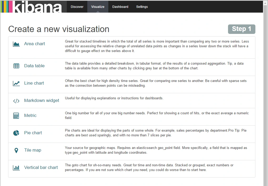 Kibana의 상단 메뉴에서 Visualize를 선택하면 새로운 가시화 패널을 만들 수 있습니다.