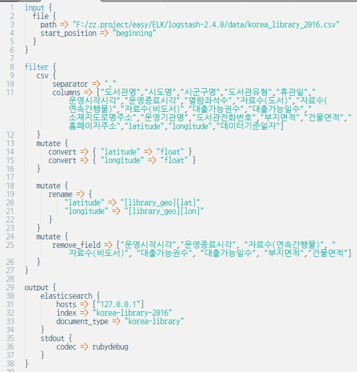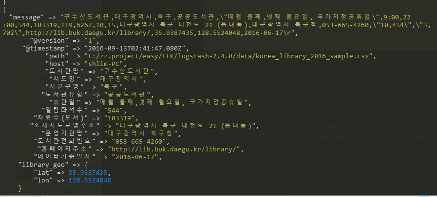 bin/logstash.bat -f conf/lib_csv.conf 실행합니다.