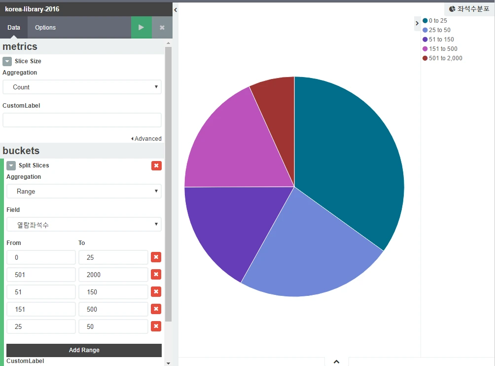 Aggeration은 Range를 선택하고 열람좌석수를 기준으로 다음과 같이 Range를 나눠줍니다.