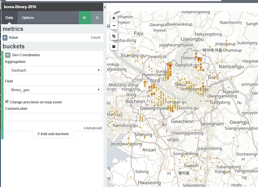 Geohash, library_geo를 선택합니다. 그리고, Option에서 Scaled Circle Markers를 선택하면 아래와 같이 나타납니다.