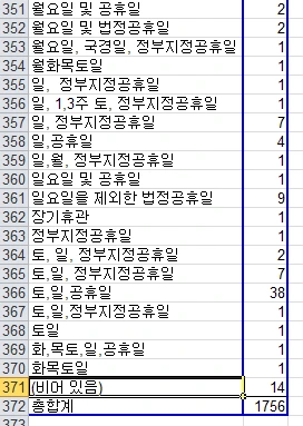 특히 휴무일의 경우 따옴표 존재, 쉼표, 근무일과 휴무일이 혼재되어 있어 총 371개의 유형 존재