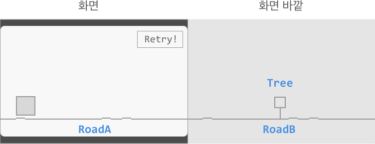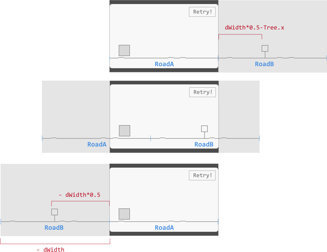 아, 그리고 roadAni의 x가 -dWidth이고, treeAni의 x가 - dWidth*0.5 인 이유는 아래와 같습니다. 위에서 아래로 애니메이션의 진행 순서입니다.
