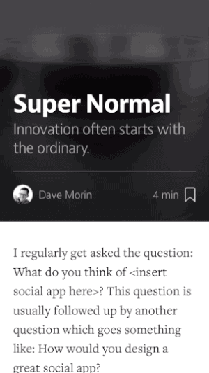 진지한 글쓰기를 표방하는 서비스이죠. 앱이 나오기 전 이미 웹에서도 시원시원하게 이미지를 표시하는 레이아웃을 제공하고, 대표이미지를 부각시키는 디자인이었습니다. 모바일 버전은 Yahoo News Digest와 약간 닮기도 했는데 조금 정적인 느낌이 듭니다. 아마도 '아래 진지한 글 읽기 준비됐어?' 하는 정도의 들어가기 느낌으로 이미지를 하나의 장치로 넣은 느낌입니다. 이미지는 그대로 있고, 그 위에 중첩된 글 제목,부제,글쓴이,읽기 시간 등의 정보만 탄성을 가지고 움직이기 때문에 조금 더 무게감이 느껴집니다.