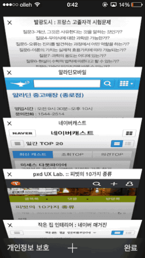 확실히 내가 보던 웹사이트들, 여러 탭들 사이를 탐색할 때라면 사이트 제목보다 그 화면을 보여주는 것이 효과적입니다. 마지막 기억과 함께 인식을 도와주는 용도로 가장 효과적이겠죠. 하지만 그렇게 하려면 표시 공간에 대한 트레이드오프가 생길 수 밖에 없는데요, Safari는 현실세계의 서류함을 메타포로 하여 적절하게 풀어냈습니다. 서류함에서 서류를 찾을 때도 하나하나 꼼꼼히 보지 않고 서류함 안의 서류들을 앞으로 슥슥 넘겨가며 찾듯, 대략적인 전체이미지로 파악할 수 있도록 했습니다. 그리고 페이지의 끝에 다다르면 입체감을 통해 그 메타포를 적극적으로 표현해서 리스트 방식을 이해할 수 있도록 도와줍니다.