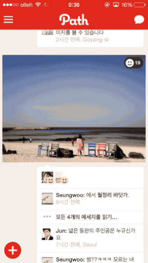 소규모의 닫힌 SNS인 Path입니다. 아기자기한 인터랙션들이 많이 들어있는데요, 타임라인의 상단에는 자신의 타임라인 대표 이미지가 슬쩍 표시됩니다. 그리고 최상단에서 더 아래로 끌어내리면 대표이미지의 가려진 부분들이 더 보이죠. Yahoo News Digest와는 또 다른 느낌입니다. 앞의 것이 이미지 확대에 대한 탄성 효과를 주로 보여주려고 했다면, 이것은 가려진 부분을 슬쩍 보여주는 것과 이미지를 이동시키는 것에 대한 탄성을 주었죠. 매번 보게되는 이미지를 너무 거슬리지 않게, 또 심심하지 않게 보여주는 적절한 인터랙션입니다. 가끔 손가락으로 끄집어 내려서, '원래 사진이 어떤 모습이었지?' 하고 보기도 합니다.