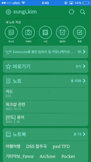 에버노트의 첫화면은 언제나 익숙해지기 힘든 느낌입니다 ^^ 여러 방식의 노트 작성 메뉴, 바로가기, 최근노트, 노트북, 태그 등 많은 것들을 빠르게 접근해주게 해야한다는 압박감이 느껴지기도 하는데요. 이 화면에서 페이지의 끝을 더 내리면, 각 요소들이 서로 멀어지며 공간이 늘어나는 탄성효과를 볼 수 있습니다. 마치 고무줄로된 팔찌를 늘리면 고무줄에 달려있는 장식들이 멀어지는 것처럼요. 이런 효과가 화면의 많은 요소들을 분리해서 인식할 수 있도록 어느정도 도와줍니다. 다닥다닥 붙어있던 요소들이 멀어지며 '이만큼은 노트, 저만큼은 노트북이야' 라고 말하는 것처럼요.