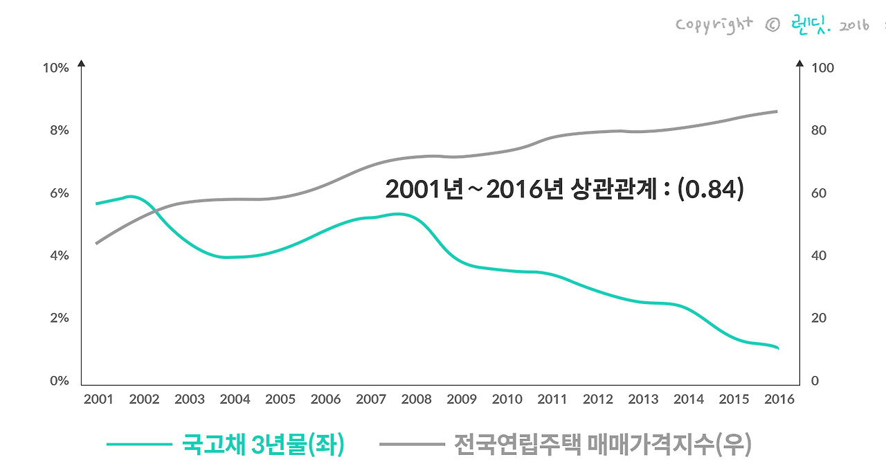 눈여겨 볼 부분은 시장금리와 부동산 가격의 상관 관계다. 2001년부터 2016년 현재까지의 국내 부동산 가격을 살펴 보면 시장금리와 0.84의 높은 음의 상관 관계를 보이고 있다. 따라서 2014년부터 급격해진 부동산 시장 과열과 2017년 시작될 본격적인 시장금리 상승을 고려해 보면, 국내 5대 은행장들이 1997년 말 외환위기 수준의 부동산 위기를 우려하는 이유가 충분히 이해된다.