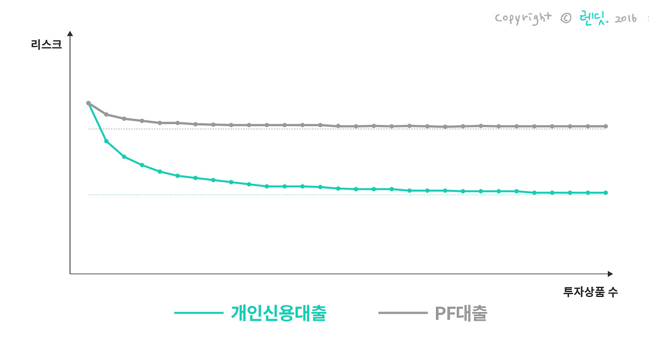시장이 합리적으로 형성되어 있다는 가정 하에는 평균 금리가 더 높은 PF대출의 리스크가 더 높겠지만, 이를 동일하다고 가정해보기로 한다. 위 그래프에서 투자 대상의 갯수(x축)가 늘어나는 것 대비 리스크(y축) 감소 폭을 살펴보면, PF대출 역시 특정 지역에 집중되어 있지는 않기 때문에 분산효과가 전혀 없지는 않지만 유의미한 분산투자 효과를 보기 어렵다. 반면, 개인신용대출의 경우 특정 산업군이 무너지더라도 전체에 미치는 영향은 제한적이기 때문에 투자금을 나눠담을수록 리스크를 확연히 줄일 수 있다.
