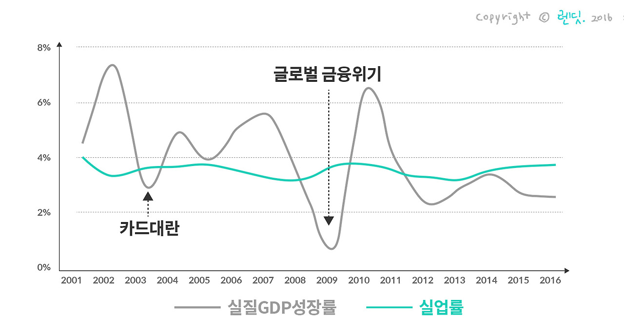 반면 2001년부터 현재까지의 국내 경제성장률과 실업률은 0.01의 낮은 상관 관계를 보이고 있다. 사실상 독립적인 양상을 보인다고 분석할 수 있는 수치다. 위 그래프에서 보이듯 2003년 카드대란이나 2009년 미국발 금융위기에도 실업률은 3~4% 수준을 유지했다. 실업률은 개인신용대출의 연체율과 가장 높은 상관 관계를 갖는데, 실제로 국내 카드사들의 지난 10년 간의 평균 연체율은 2.4% 수준에서 안정적으로 유지되고 있다. 외환위기 이후 소비 촉진을 위한 경기 부양 노력이 결국 2003년 카드대란으로 이어졌으나, 신용평가 인프라 강화와 고객 관리기법 개선, 금융당국 감독 강화로 시장이 안정된지 10년이 넘었다 (이는 다음 포스트에서 살펴보기로 한다).