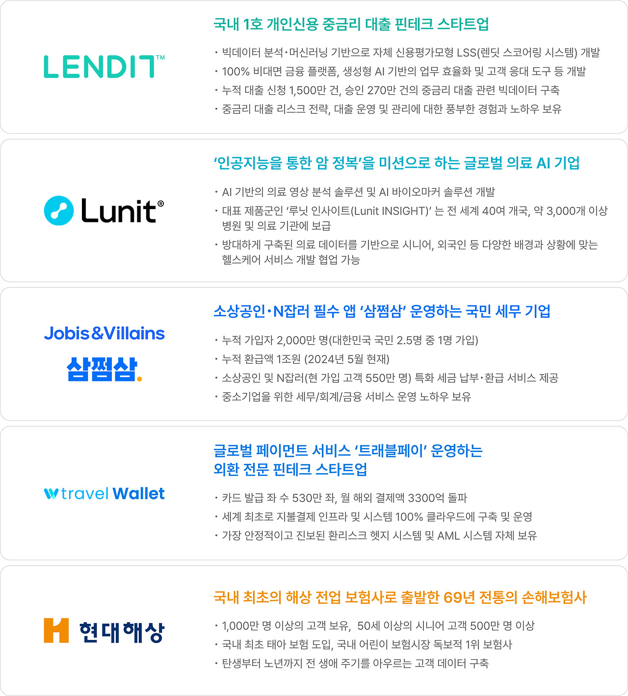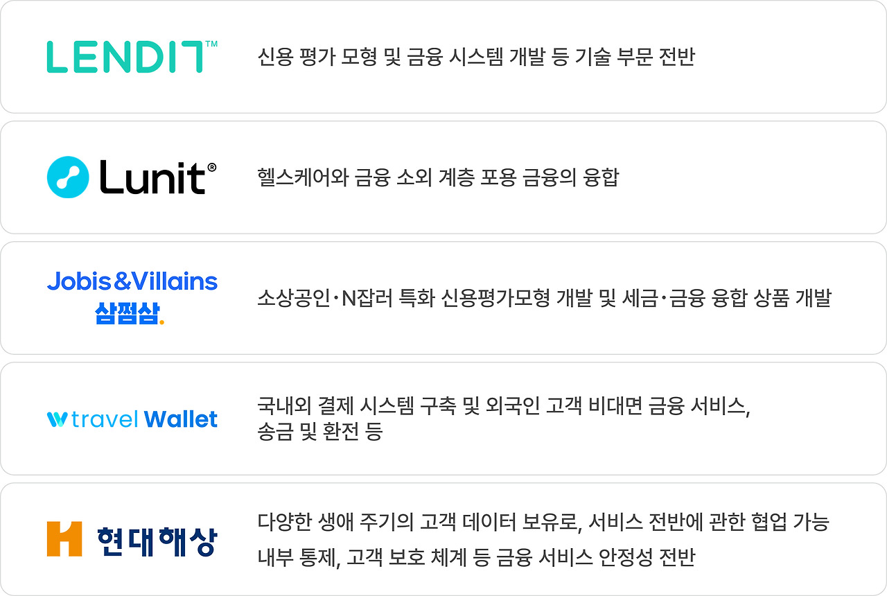 현대해상의 보험 데이터와 루닛의 의료 데이터는 시니어의 신용 분석을 위해 활용할 수 있는 아주 좋은 대안 데이터가 될 것이다. 삼쩜삼의 세무 데이터는 소상공인과 중소기업, 트래블월렛은 외국인 대안 데이터 축적을 위한 협업이 가능하다. 렌딧은 2015년 창업 이후 9년 간 개인들을 위한 중금리대출 공급과 관련 기술을 개발해 온 역량과 노하우를 투입할 예정이다.