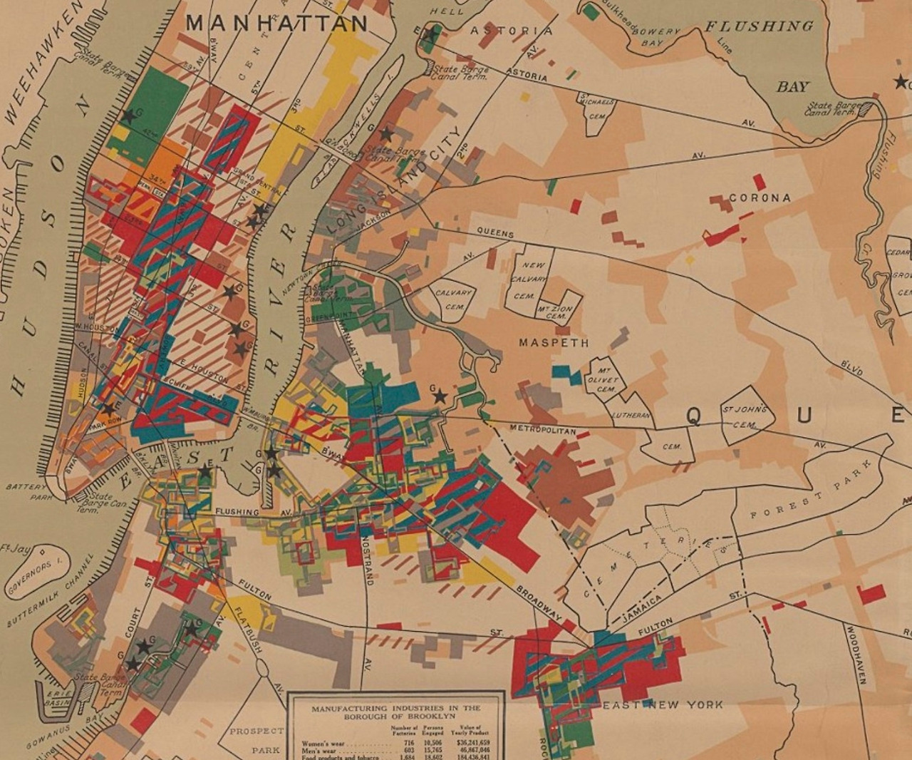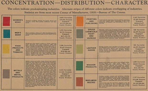 아래 지도는 1919년 맨해튼 인근의 제조업 산업별 지역을 나타낸다. 빨간색은 여성 의류 공장들이고 파란색은 남성 의류 공장들이다. 맨해튼 미드타운 및 대부분 도심 중심 지역들에서 의류 공장들이 밀집해 있었다. 100년 전 1920년대에만 해도 대부분의 인구가 맨해튼과 브루클린에 거주했고 그랜드 센트럴역, 펜스테이션역 같은 철도와 지하철 중심으로 교통이 이루어져 공장들이 맨해튼 및 브루클린 도심 지역에 많았다.
